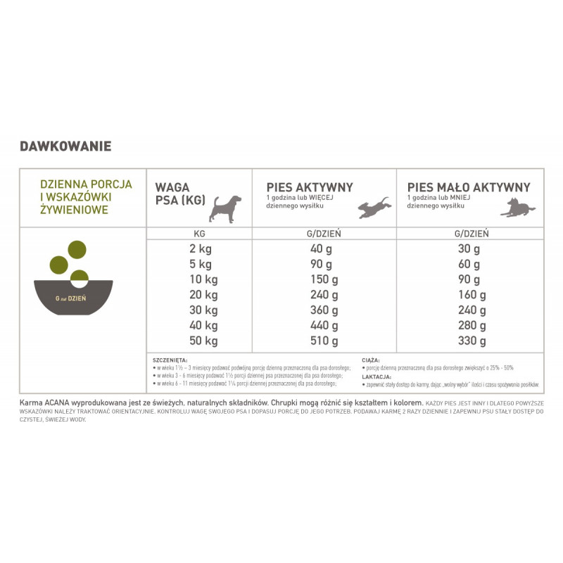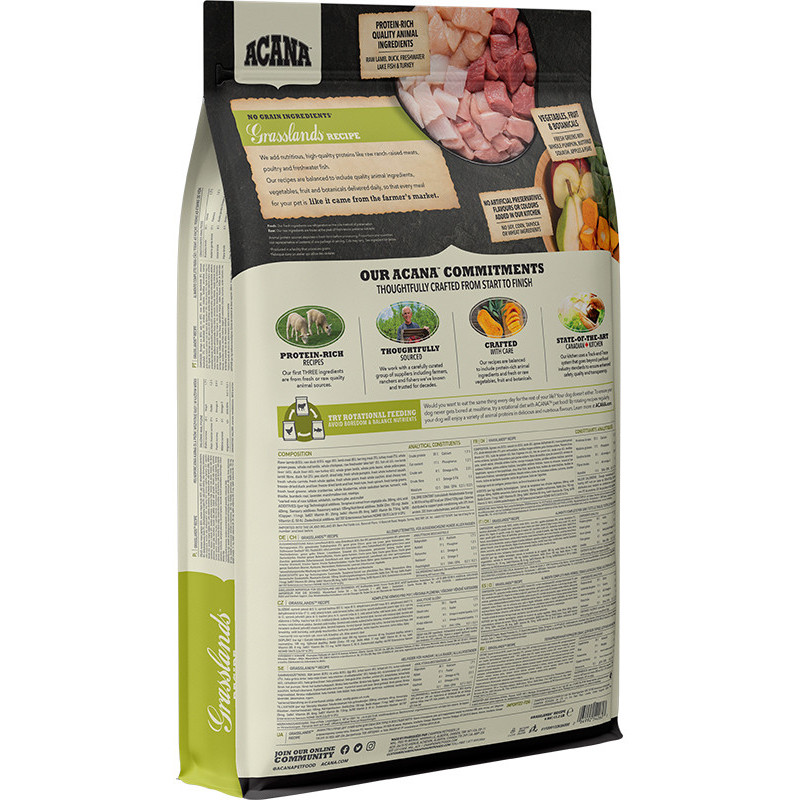 Karma ACANA Highest Protein Grasslands jest idealna dla miłośników zwierząt na całym świecie. Zawiera ona składniki odżywcze w proporcjach WholePrey, które są najlepiej przystosowane do potrzeb żywieniowych psów. Układ pokarmowy psów dzisiejszych czasów jest podobny do ich przodków, dlatego uważamy, że powinny one jeść tak, jak oni, czyli spożywać całe zdobycze, takie jak mięso mięśniowe, wątroba, żołądki, kości i chrząstki. ACANA Grasslands jest wolna od glutenu i w 70% oparta na składnikach mięsnych, co stanowi prawie dwukrotność w porównaniu do większości dostępnych karm dla psów.