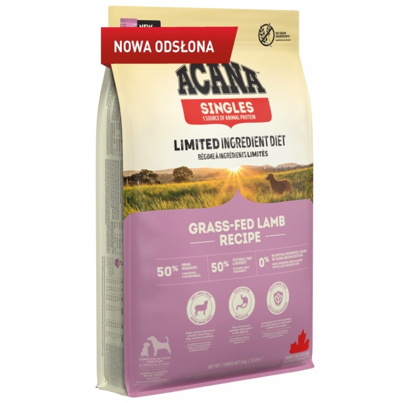 Uszkodzone opakowanie. Waga 11,3kg. Termin ważności 18.07.2027. ACANA SINGLES Grass-Fed Lamb to karma monobiałkowa, która jest idealnym rozwiązaniem dla psów wrażliwych wszystkich ras, w każdym wieku.
