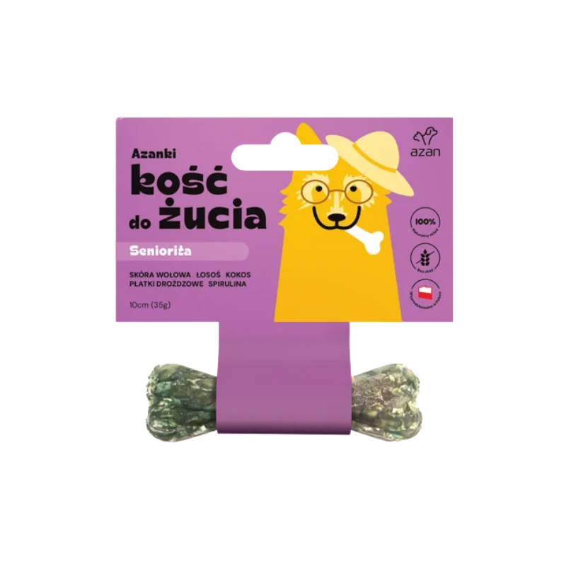 Naturalna kość do żucia Azanki dla psów seniorów – z łososiem, kokosem i spiruliną. Wspiera zdrowie, odporność i zaspokaja potrzebę żucia.