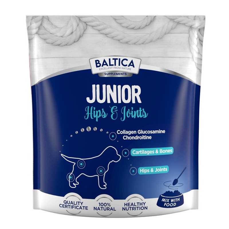 Zapewnij swojemu młodemu psu zdrowy start w dorosłe życie dzięki suplementowi Junior Hips & Joints od Baltica. Ten wysoko skoncentrowany preparat został stworzony specjalnie dla psów do 18. miesiąca życia, aby wspierać rozwój i ochronę ich stawów, ścięgien, więzadeł oraz chrząstek w kluczowym okresie wzrostu.