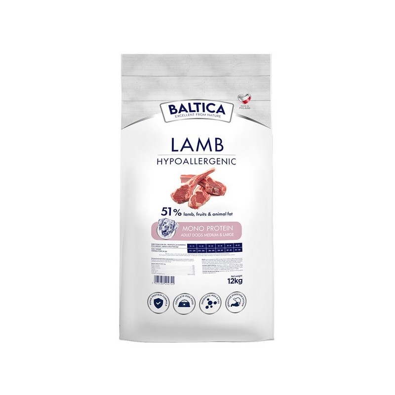 BALTICA NUTRACEUTIC Hypoallergenic Lamb and Rice to wysokiej jakości hipoalergiczna sucha karma, stworzona specjalnie dla psów średnich ras. Receptura oparta na mięsie jagnięcym dostarcza wartościowego białka, które jest lekkostrawne i idealne dla psów z wrażliwym układem pokarmowym. Dodatek lekkostrawnego ryżu wzmacnia działanie wspomagające trawienie, dzięki czemu karma jest doskonałym wyborem dla psów o skłonnościach do problemów trawiennych lub alergii.