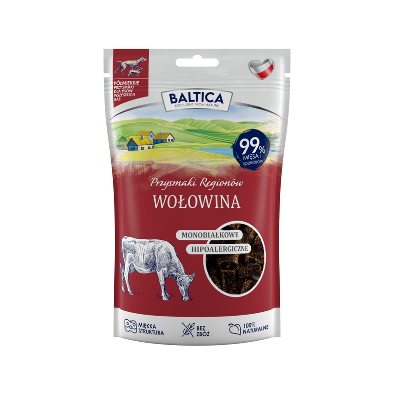 BALTICA PRZYSMAKI REGIONÓW półmiękkie wołowe to naturalne przysmaki treningowe dla psów, wykonane z wysokiej jakości mięsa wołowego, idealne jako nagroda podczas treningów, ćwiczeń i zabaw. Monoproteinowa formuła, oparta wyłącznie na wołowinie, ogranicza ryzyko wystąpienia reakcji alergicznych, co czyni je doskonałym wyborem dla psów o wrażliwym układzie pokarmowym. Przysmaki są bezzbożowe i nie zawierają sztucznych barwników, konserwantów ani aromatów. Ich półmiękka struktura sprawia, że są idealne dla psów z wrażliwymi dziąsłami i zębami, oferując jednocześnie zdrową, naturalną przekąskę.