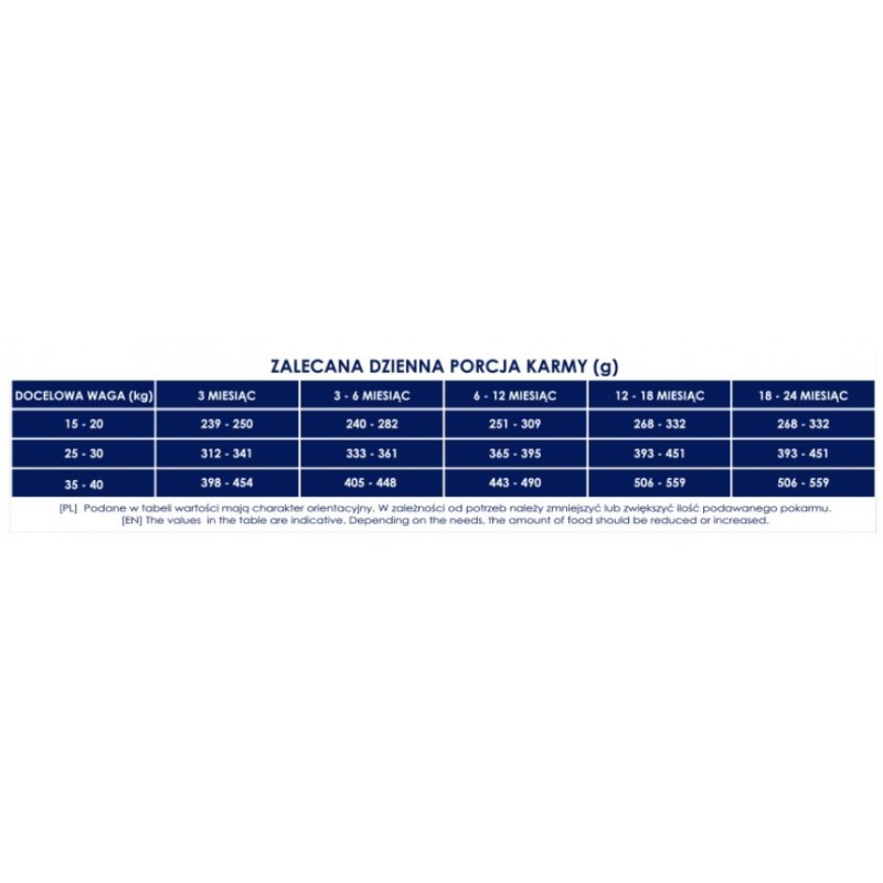 Specjalnie dobrana formuła o obniżonym poziomie białka i tłuszczu dostosowana jest do potrzeb rosnących szczeniąt, szczególnie psów dużych i olbrzymich ras, które wymagają szczególnej troski o rozwój stawów i kości. Karma wzbogacona jest o substancje chondroprotekcyjne, które wspomagają prawidłowe funkcjonowanie układu kostno-stawowego, redukując ryzyko problemów ze stawami w przyszłości.