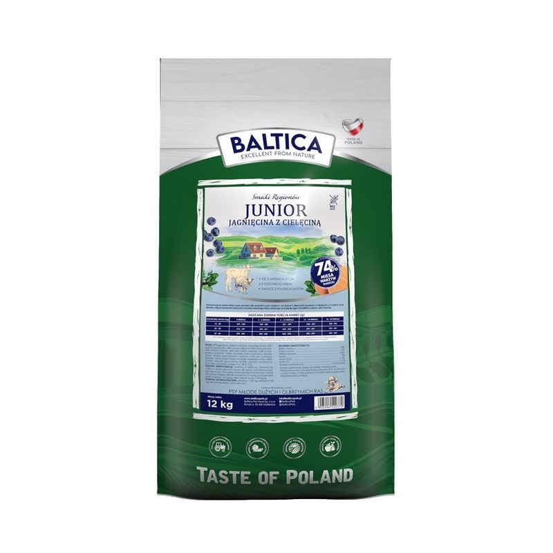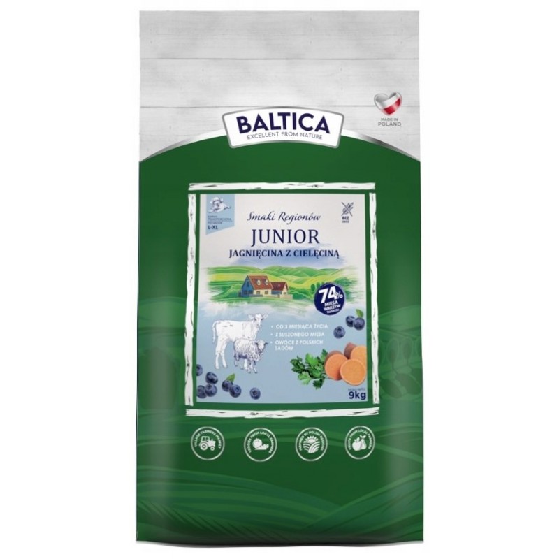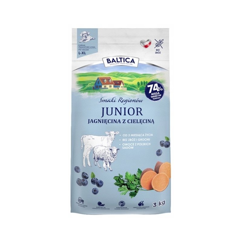 BALTICA SMAKI REGIONÓW Junior Jagnięcina z cielęciną to sucha karma stworzona specjalnie dla młodych psów dużych i olbrzymich ras, wspierająca ich prawidłowy rozwój od 3 do 24 miesiąca życia. Karma oparta jest na wysokiej jakości jagnięcinie i cielęcinie, które dostarczają białka zwierzęcego o wysokiej przyswajalności, wspomagającego zdrowy wzrost i rozwój mięśni młodych psów. Bezzbożowa receptura jest delikatna dla wrażliwych układów pokarmowych, minimalizując ryzyko alergii i nietolerancji pokarmowych.