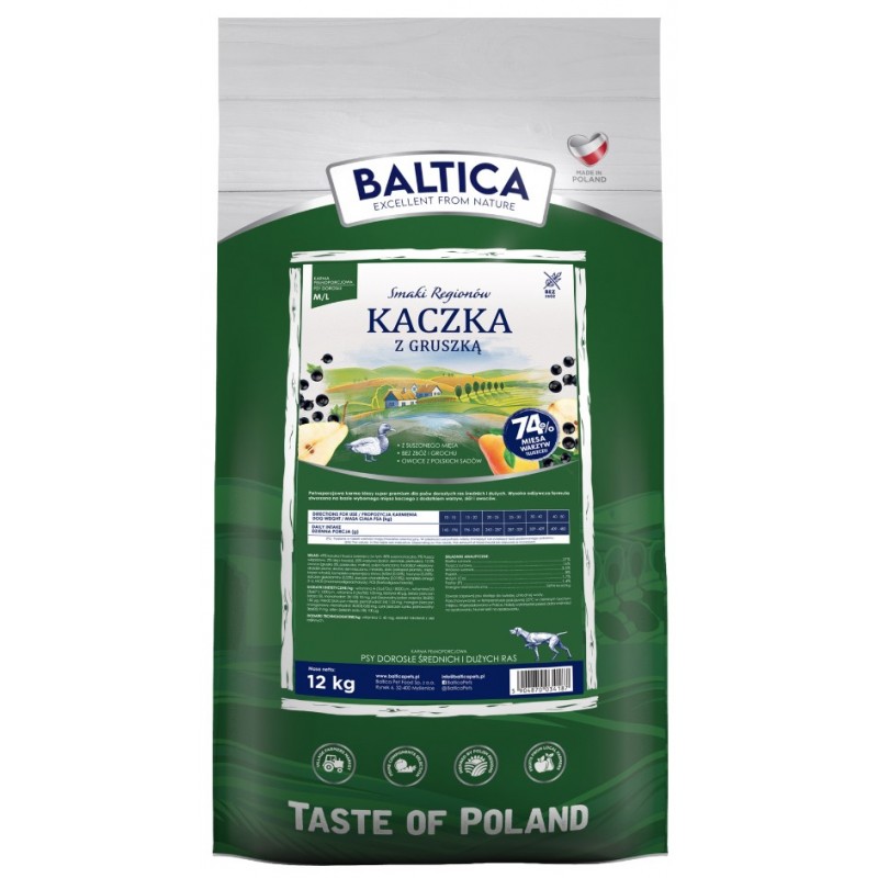 BALTICA Kaczka z gruszką M/L/XL to idealne połączenie wyjątkowego smaku i doskonałego odżywienia. Monoproteinowa formuła oraz naturalne składniki wspierają zdrowie psa, jednocześnie eliminując potencjalne alergeny. Zapewnij swojemu pupilowi zdrową, smaczną i zrównoważoną dietę każdego dnia z BALTICA SMAKI REGIONÓW Kaczka z gruszką M/L/XL!