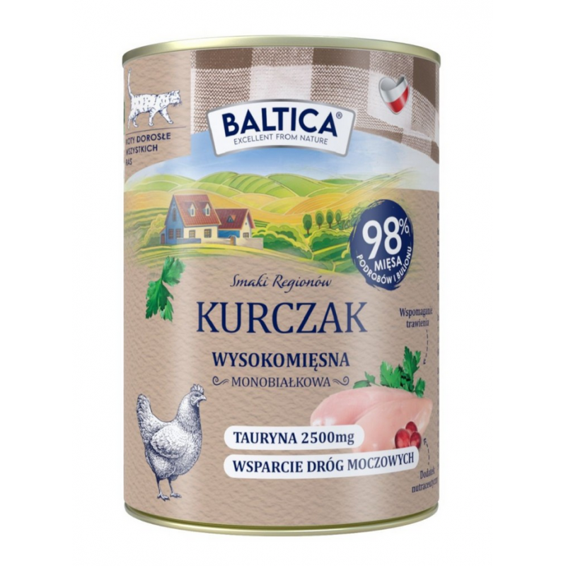 BALTICA Kurczak 400 g to nie tylko smakowity posiłek, ale także świadomy wybór w trosce o zdrowie i dobre samopoczucie Twojego kota – każdego dnia.