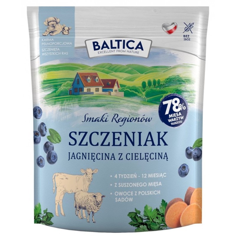 Pełnoporcjowa karma klasy super premium BALTICA SMAKI REGIONÓW Jagnięcina z Cielęciną została opracowana specjalnie dla szczeniąt wszystkich ras, by wspierać ich zdrowy rozwój już od 4. tygodnia życia. Wyjątkowa receptura oparta na wybornej jagnięcinie i delikatnej cielęcinie, wzbogacona dodatkiem batatów, sezonowych polskich owoców i aromatycznych ziół, dostarcza szczeniętom zbilansowanej diety o najwyższej jakości.
