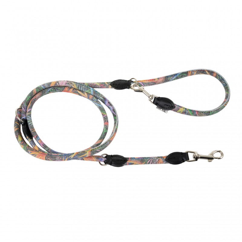 BARRY KING Smycz La Fleur to elegancka, regulowana smycz okrągła, która łączy artystyczny design, funkcjonalność i najwyższą jakość wykonania. Stworzona z naturalnej skóry, zachwyca kolorowym, kwiatowym wzorem w odcieniach niebieskiego, różu i fioletu, nadając każdemu spacerowi lekkości i wyjątkowego charakteru.