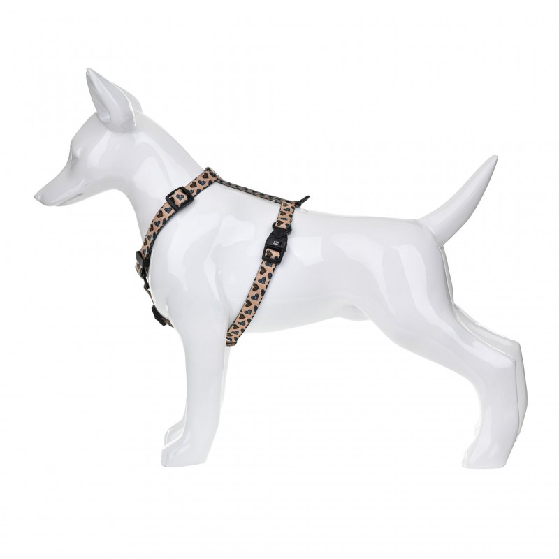 BARRY KING Szelki Safari Love to stylowe i wygodne szelki dla psa, które łączą subtelny design inspirowany naturą z wysoką jakością wykonania. Jasna, beżowa taśma została ozdobiona delikatnym motywem safari w formie zwierzęcego printu ukrytego w kształcie serduszek. Ten wyjątkowy wzór nadaje szelkom eleganckiego charakteru i sprawia, że doskonale prezentują się podczas codziennych spacerów.