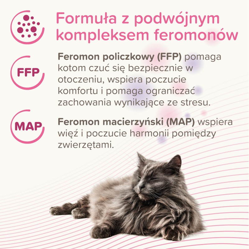 - Redukuje miauczenie, drapanie, niszczenie mebli i znakowanie moczem