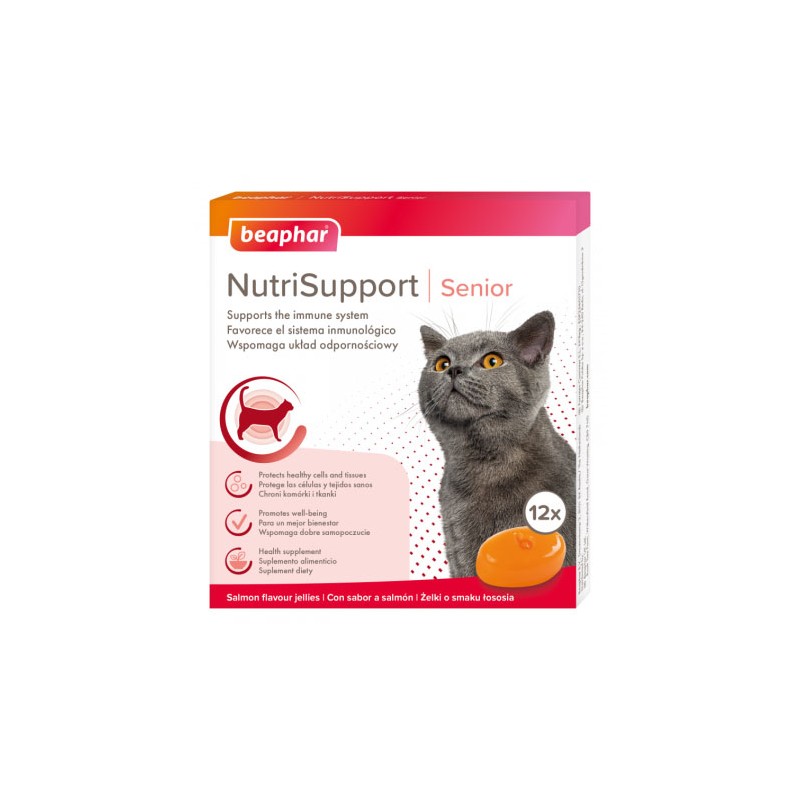 NutriSupport Senior to pyszne żelki o smaku łososia wspomagające system odpornościowy u kotów powyżej 7 roku życia lub z objawami starzenia. Produkt zawiera wyciągi z aksamitki wzniesionej (źródło luteiny) i kurkumy (źródło beta-karotenu), o których wiadomo, że chronią komórki ciała przed wolnymi rodnikami i stresem oksydacyjnym. Zawiera również drożdże, które są źródłem nukleotydów wspomagających regenerację komórek. Produkt bez sztucznych barwników, hipoalergiczny, o niskiej wartości kalorycznej, doskonale dostosowany jako dodatek do diety kota, wspierający jego system immunologiczny. Stworzony na bazie naturalnych substancji aktywnych.