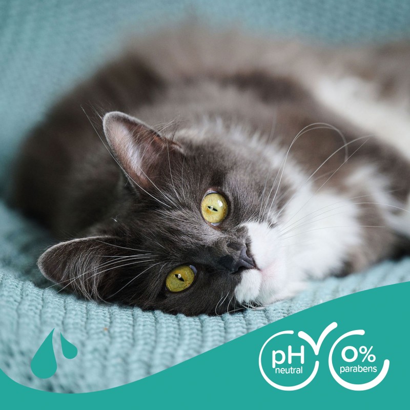 Sposób użycia: zwilż sierść kota ciepłą wodą, wmasuj odpowiednią ilość szamponu, dokładnie spłucz i w razie potrzeby powtórz czynność.