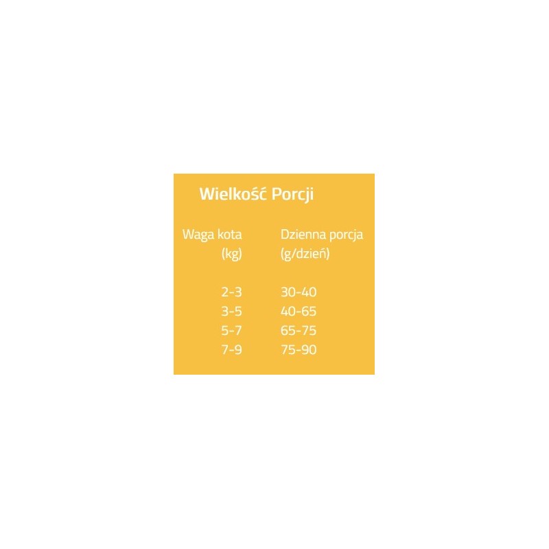 - białko surowe 34,0%, tłuszcz surowy 16,0%, włókno surowe 1,2%, popiół surowy 8,2%, wilgotność 10,0%, kwasy tłuszczowe omega-3 0,8%, kwasy tłuszczowe omega-6 2,2%, wapń 1,1%, fosfor 0,8%, sód 1,0%, magnez 0,1%.