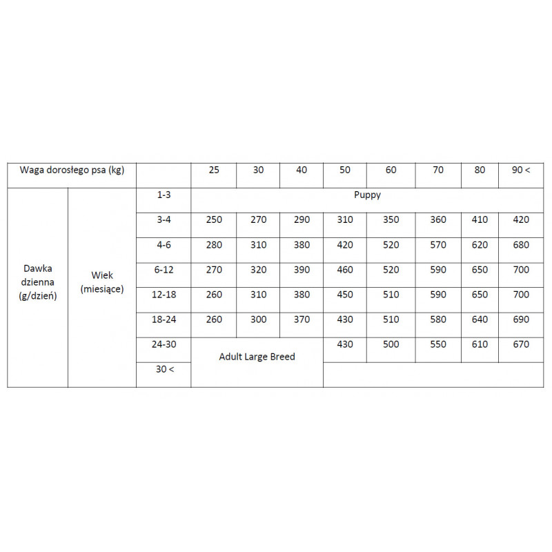 Pełnoporcjowa, bezzbożowa karma dla psów z dodatkiem łososia i ziemniaków. Przeznaczona jest dla młodych psów (3 miesiące – 2 lata) dużych ras (powyżej 25 kg).