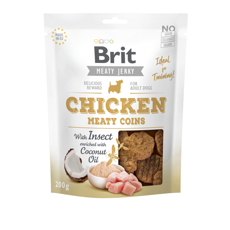 BRIT JERKY Chicken with Insect Meaty Coins łączy wysoką zawartość mięsa z nowoczesnym, ekologicznym źródłem białka, jakim są insekty. Dzięki niewielkiemu rozmiarowi i miękkiej konsystencji smakołyki doskonale sprawdzają się jako nagroda podczas treningu, motywator w trakcie nauki komend lub smakowite uzupełnienie codziennej diety psa.