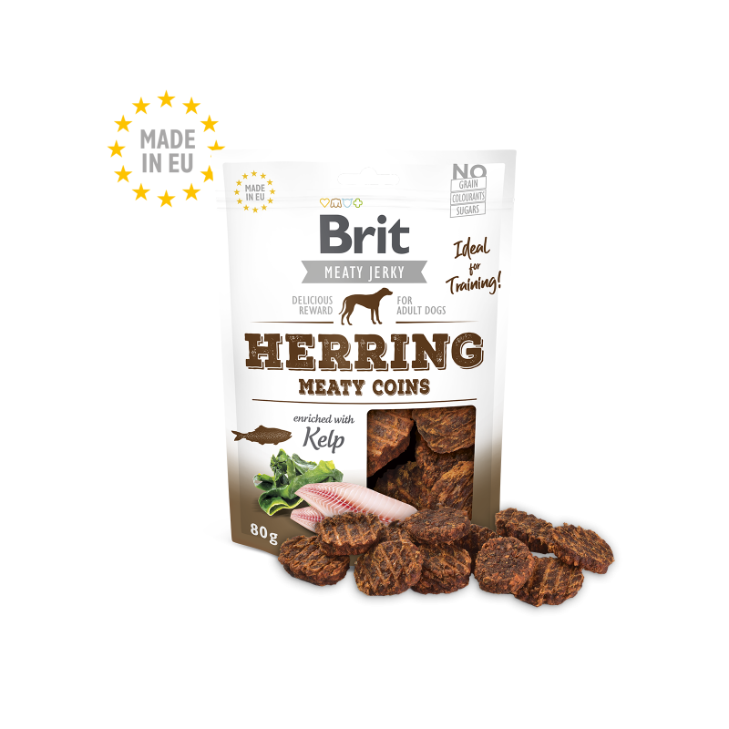 Bezzbożowe przysmaki dla psa Brit Jerky Herring Meaty Coins z kurczakiem i śledziem to mięsne smaczki treningowe z algami wspierającymi zdrowie zębów.