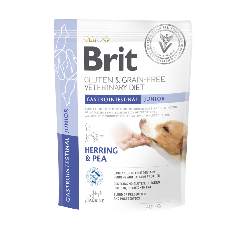 BRIT Veterinary Diets Gastrointestinal Junior to specjalistyczna, bezzbożowa karma weterynaryjna, opracowana z myślą o szczeniętach, młodych psach oraz sukach w okresie ciąży i laktacji, które zmagają się z problemami żołądkowo-jelitowymi. To czas wyjątkowo intensywnego wzrostu i zwiększonych potrzeb żywieniowych, dlatego dieta musi być jednocześnie lekkostrawna, wysokoenergetyczna i precyzyjnie zbilansowana.
