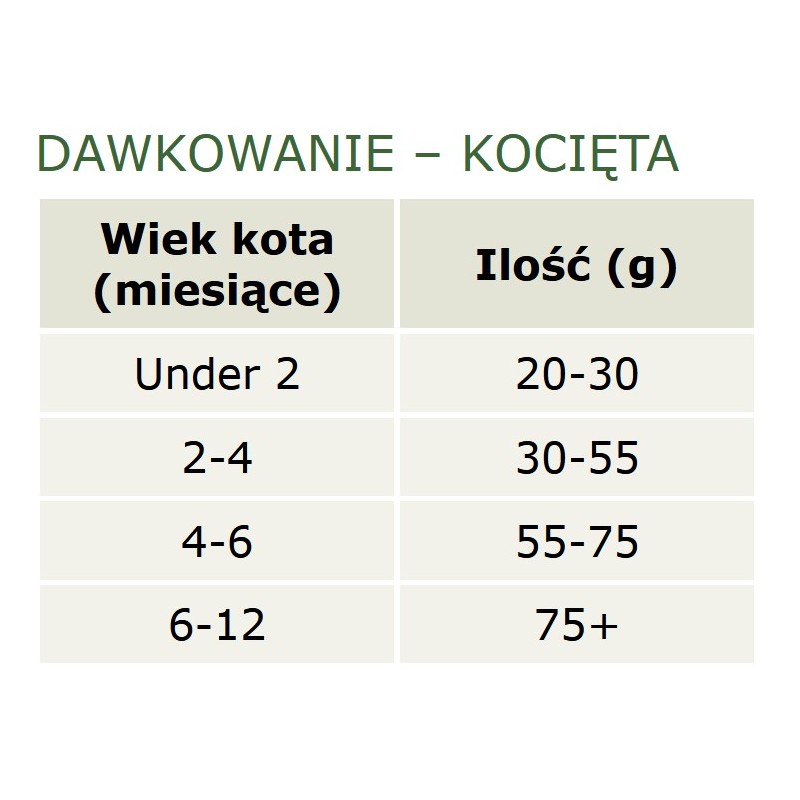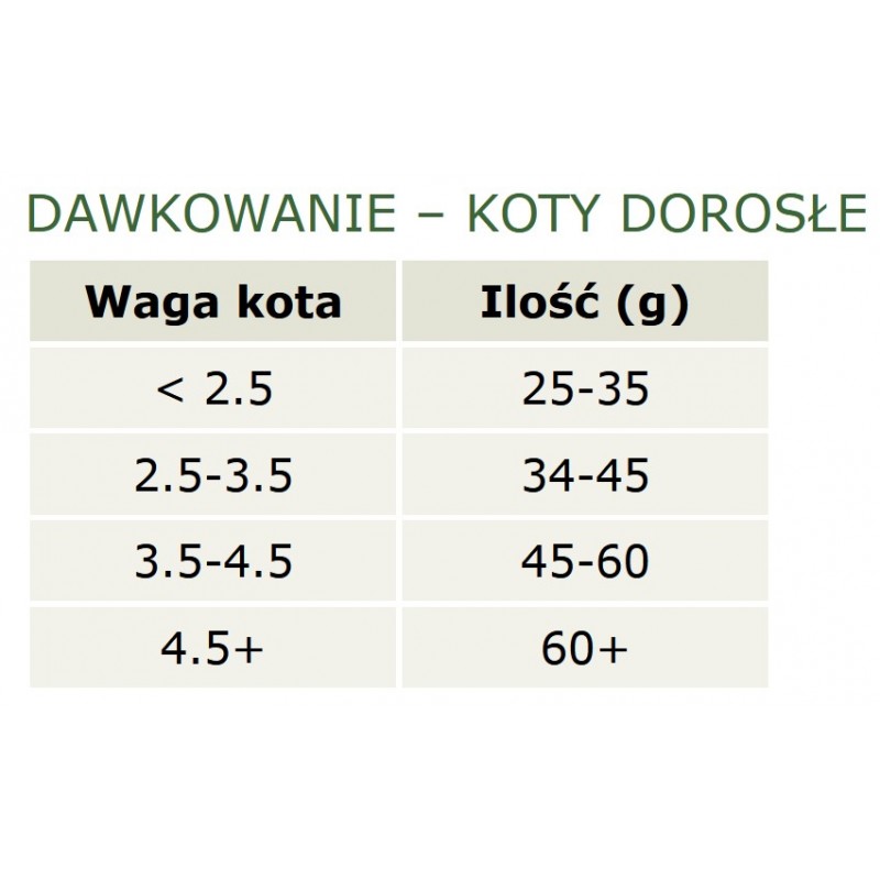 Każdy kot jest inny i optymalna ilość karmy dziennie może się różnić w zależności od czynników takich jak wiek, aktywność, metabolizm i środowisko. Na początek proponujemy, aby rozpocząć karmienie od dolnego pułapu podanego w tabelce. Należy kota obserwować i dostosować ostateczną ilość do rzeczywistych potrzeb. Jeśli kot sprawia wrażenie, że zaczyna nabierać nadwagę, należy zmniejszyć ilość karmy o 10%, jeśli kot sprawia wrażenie że ma niedowagę, należy zwiększyć ilość karmy o 10%. Podawać tyle karmy, aby twój kot zachowywał się normalnie i uzyskał właściwą wagę.