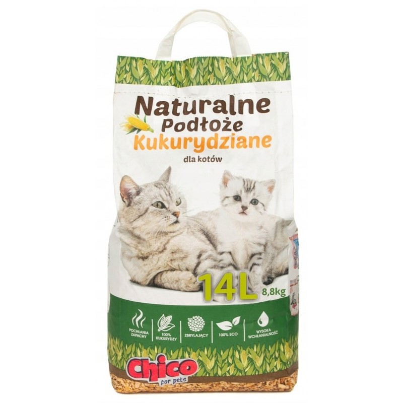 Chico Podściółka kukurydziana to innowacyjna i przyjazna dla środowiska opcja do użytku dla kotów w kociej toalecie. Została stworzona z wysokiej jakości ziaren kukurydzy, co zapewnia wiele korzyści dla Twojego kota i środowiska. Produkt ma zdolność do natychmiastowego zamykania w formie ściągniętych grudek odchodów kota, co pozwala na łatwe i wygodne usuwanie ich z kociej toalety. Dzięki temu, podczas czyszczenia kociej toalety, nie ma konieczności usuwania całej zawartości kuwety, lecz tylko ściągnięte grudki, co pozwala na oszczędność i zmniejszenie ilości odpadów.