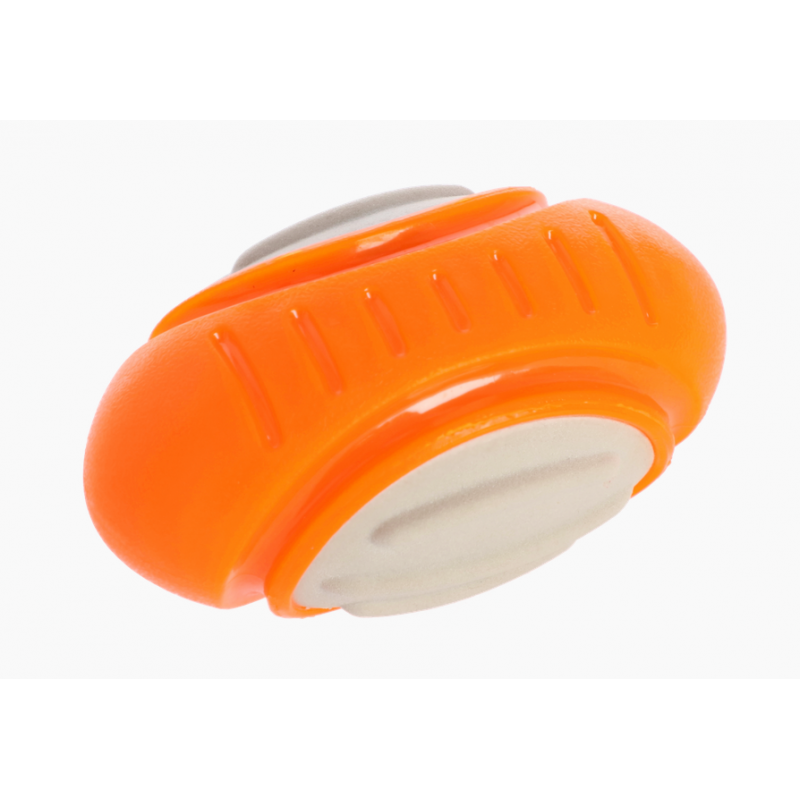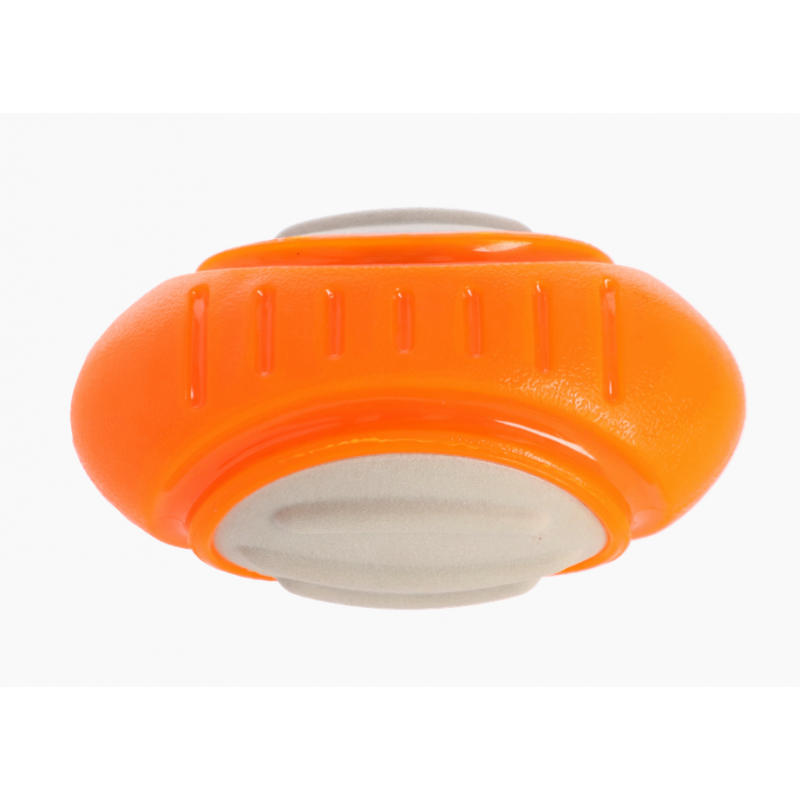 Charakterystyczny kształt rugby sprawia, że piłka odbija się i toczy w nieprzewidywalny sposób, co dodatkowo pobudza instynkt łowiecki psa i zachęca do aktywnej zabawy. Wewnątrz zabawki znajduje się piszczałka, która wydaje dźwięk podczas nacisku i jeszcze bardziej motywuje pupila do interakcji.