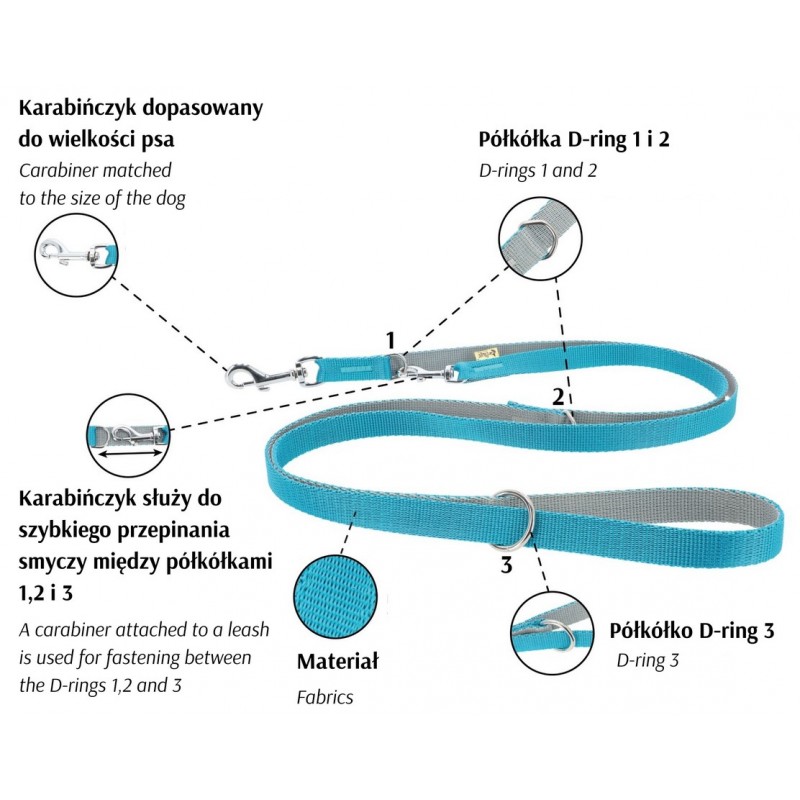 Dzięki trójstopniowej regulacji długości (120 / 160 / 220 cm) smycz doskonale sprawdzi się zarówno w mieście, jak i na dłuższych spacerach. Krótsze ustawienie pozwala trzymać psa blisko, co jest przydatne w komunikacji miejskiej lub u weterynarza. Regulacje 160 i 220 cm dają więcej swobody i umożliwiają przewieszenie smyczy przez ramię lub przypięcie jej w pasie – idealne na relaksujące wędrówki.