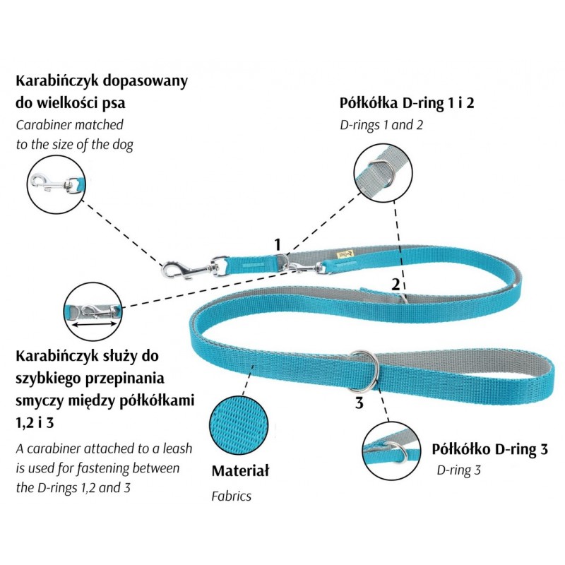 Dzięki regulacji długości i możliwości przepięcia smycz idealnie dopasowuje się do różnych sytuacji.