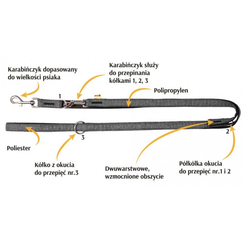 Szukasz smyczy, która łączy elegancki wygląd, trwałość i maksymalną funkcjonalność? Przepinana smycz z kolekcji Scandi to doskonały wybór dla wymagających opiekunów psów. Wykonana z materiału podszytego mocną taśmą polipropylenową, jest przyjemna w dotyku, odporna na zabrudzenia i bardzo łatwa w utrzymaniu czystości – wystarczy pranie w pralce w 30°C, by znów wyglądała jak nowa.