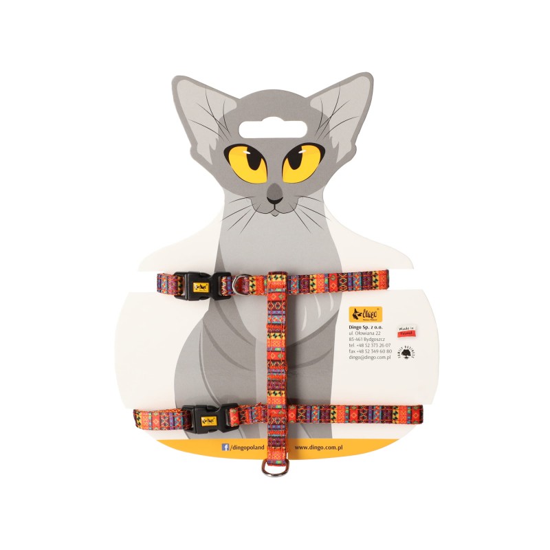 DINGO Szelki dla kota America Mexico to wygodne, bezuciskowe i stylowe szelki spacerowe, zaprojektowane z myślą o kocich elegantach i codziennych, bezpiecznych spacerach. Taśma z trwałym, nieścieralnym nadrukiem zachowuje intensywne kolory nawet przy długotrwałym użytkowaniu, dzięki czemu szelki – podobnie jak pasująca smycz – posłużą przez wiele lat.