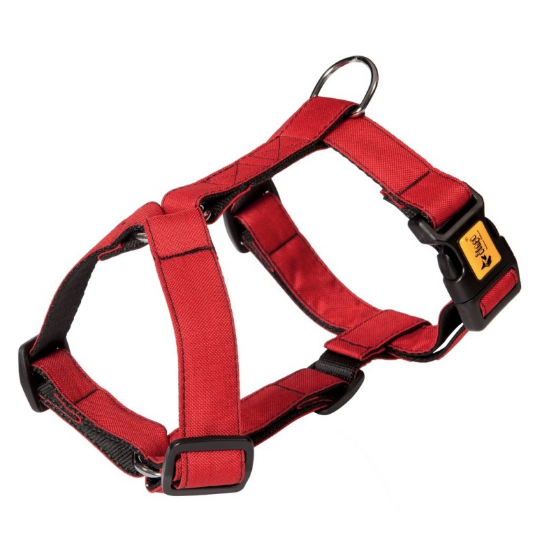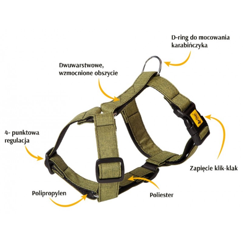 Obroża została wykonana z taśmy polipropylenowej pochodzącej z recyklingu, stworzonej z przetworzonych butelek plastikowych (poliester rPET, standard 100 OEKO-TEX). Dzięki temu jest nie tylko wytrzymała i odporna na ścieranie, ale także przyjazna dla środowiska. Regulacja obroży odbywa się płynnie i bezstopniowo, co pozwala na idealne dopasowanie do obwodu szyi psa. Klamra z trwałego plastiku zapewnia szybkie i wygodne zakładanie.
