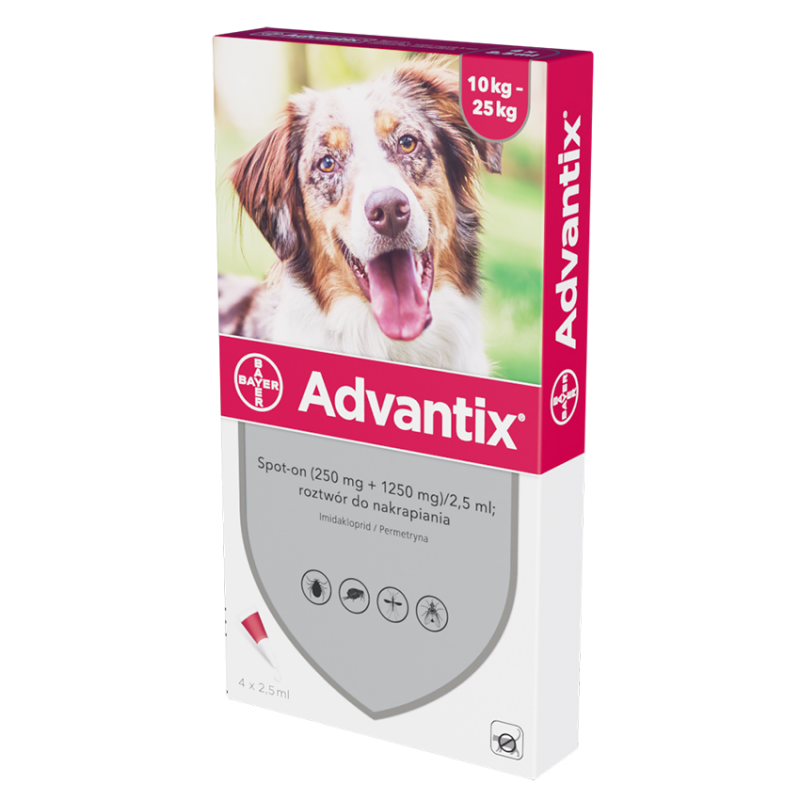 Dobra informacja dla właścicieli psów jest taka, że z ochrony, jaką daje roztwór Advantix, mogą korzystać zarówno szczenięta (powyżej 7 tygodnia życia), jak i zwierzęta dorosłe. Jeśli chodzi o zwierzaki dorosłe, Advantix przygotował cztery warianty produktu (wielkości pipet), w zależności od wagi pupila: