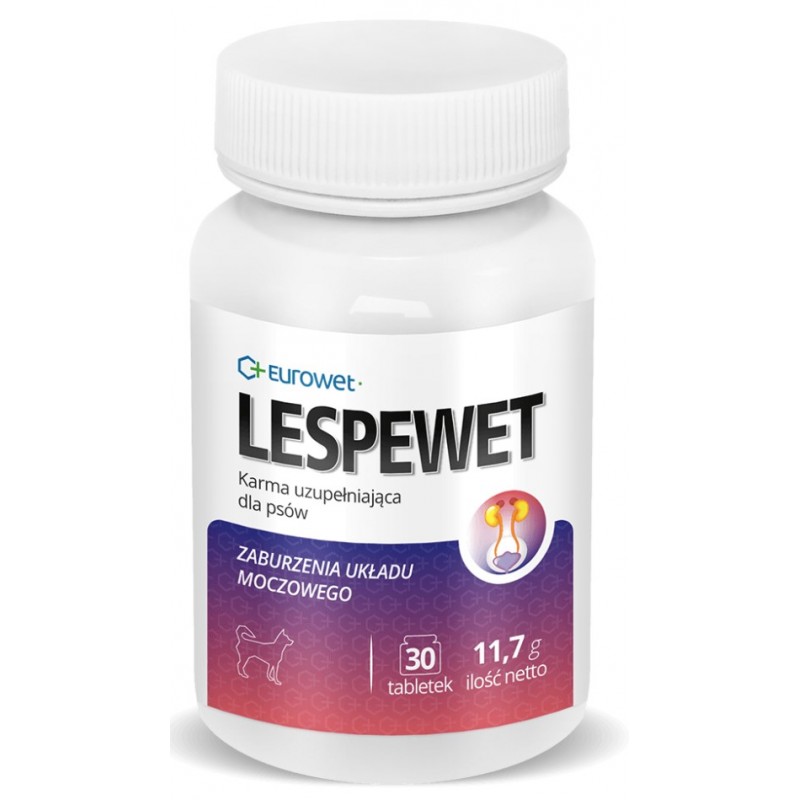 EUROWET Lespewet to zaawansowana karma uzupełniająca w formie tabletek, specjalnie opracowana, aby wspierać i optymalizować funkcjonowanie układu moczowego u psów. Zawarte w wygodnym opakowaniu 30 tabletek, ten skuteczny suplement diety jest idealnym rozwiązaniem dla psów, które wymagają szczególnej opieki nad swoimi drogami moczowymi i nerkami.