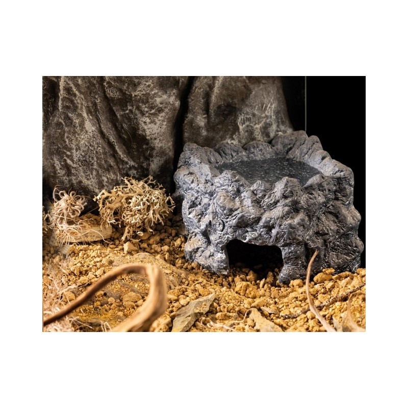 EXO TERRRA Wet Rock to ceramiczna kryjówka z miską, specjalnie zaprojektowana do zastosowania w terrarium. Stworzona, aby zapewniać wysoką wilgotność, posiada wbudowane wgłębienie, które może służyć jako miseczka. Wykonana z porowatej porcelany, jest trudna do przewrócenia i odporna na nagłe zmiany wilgotności oraz temperatury. Jej unikatowy narożny kształt pozwala na efektywne wykorzystanie przestrzeni w terrarium, a jednocześnie zapewnia doskonałe schronienie dla gadów i płazów. Dodatkowo, kryjówka ta jest łatwa w czyszczeniu, co ułatwia utrzymanie higieny w środowisku życia zwierząt.