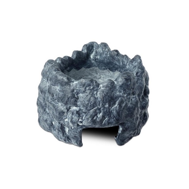Ceramiczna kryjówka z miską do terrarium, zaprojektowana do utrzymania wysokiej wilgotności. Ma porowatą strukturę i narożny kształt, co czyni ją stabilną i odporną, idealna dla gadów.
