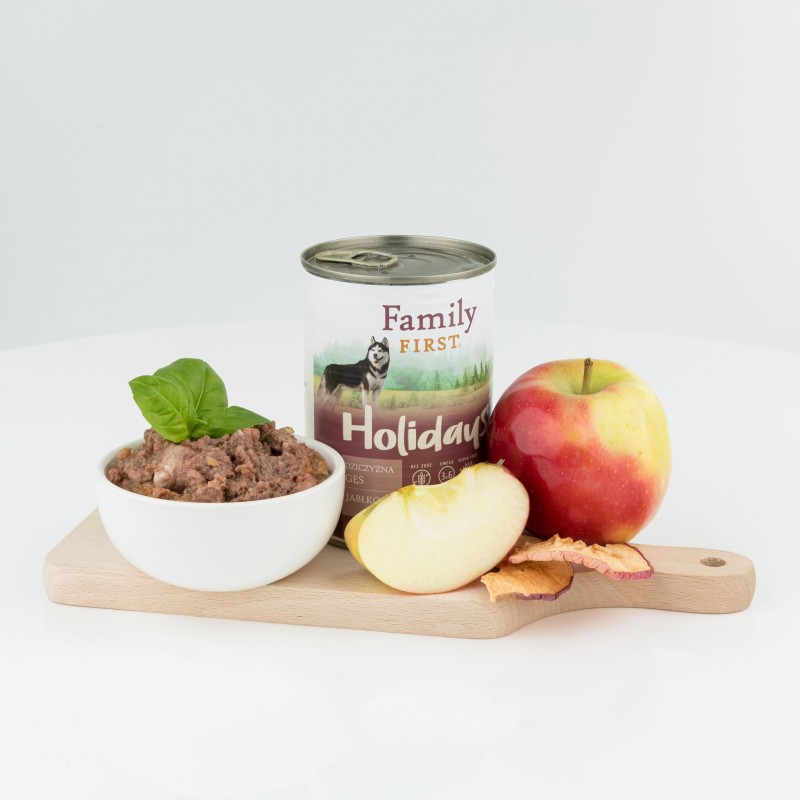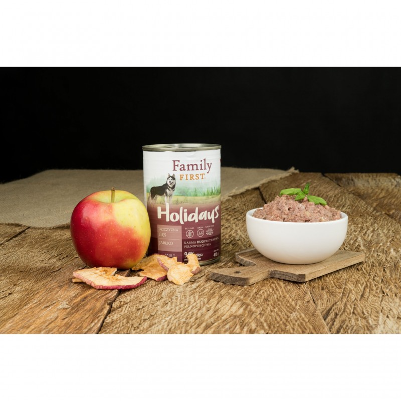 FAMILY FIRST Holidays Dziczyzna/Gęś/Jabłko 400 g to pełnoporcjowa mokra karma dla psów dorosłych, łącząca szlachetne mięsa z funkcjonalnymi dodatkami wspierającymi zdrowie i codzienną witalność. Receptura nie zawiera pszenicy ani mięsa kurczaka, dzięki czemu jest lekkostrawna i odpowiednia również dla psów z alergiami pokarmowymi.