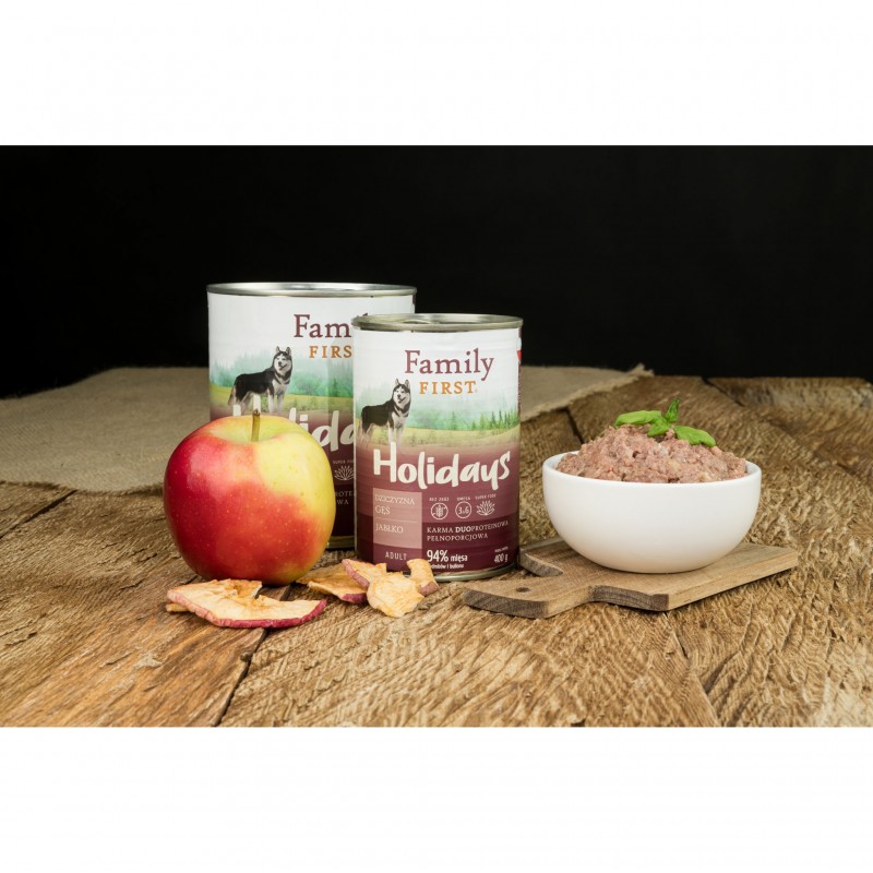 FAMILY FIRST Holidays Dziczyzna / Gęś / Jabłko to aromatyczna, mięsna kompozycja która, wspiera odporność, zdrowe stawy i prawidłowe trawienie, zapewniając dorosłemu psu pełnowartościową dietę każdego dnia.