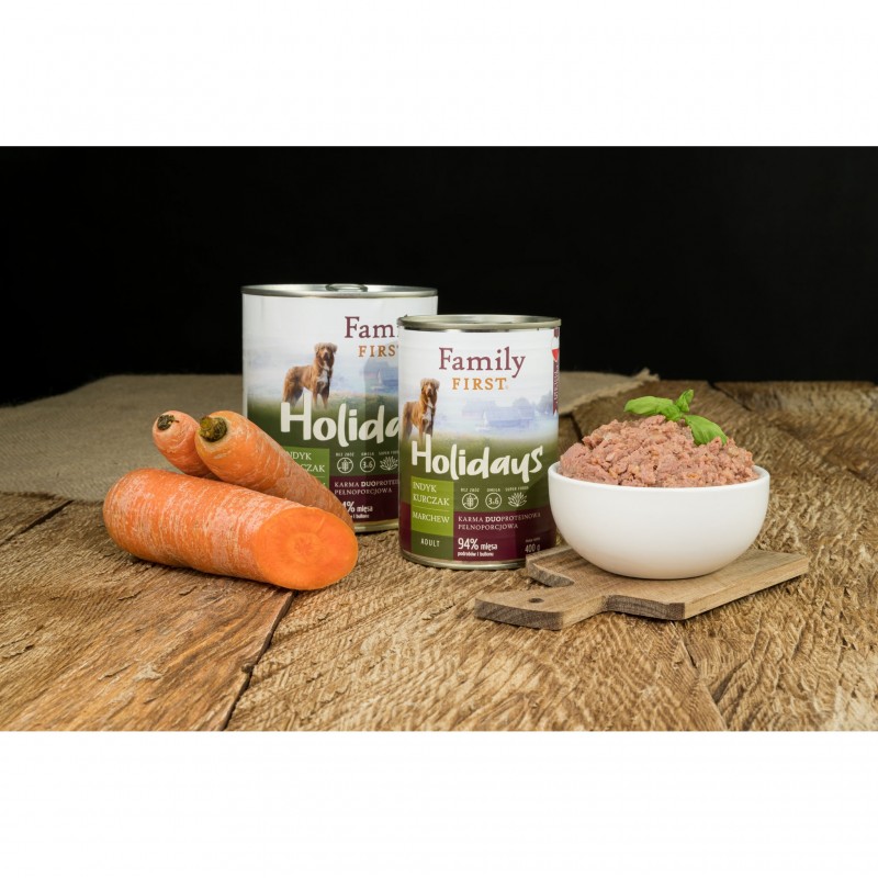 FAMILY FIRST Holidays Indyk / Kurczak / Marchew to mięsno-warzywna kompozycja która, wspiera prawidłową wagę, zdrowe stawy i piękną sierść, zapewniając dorosłemu psu pełnowartościową dietę każdego dnia.