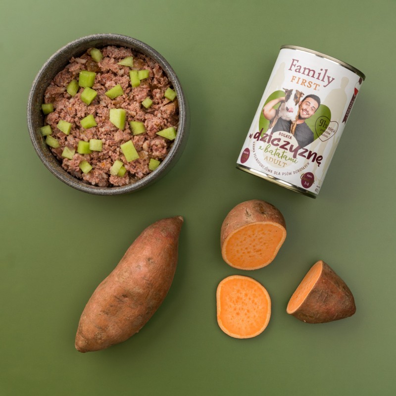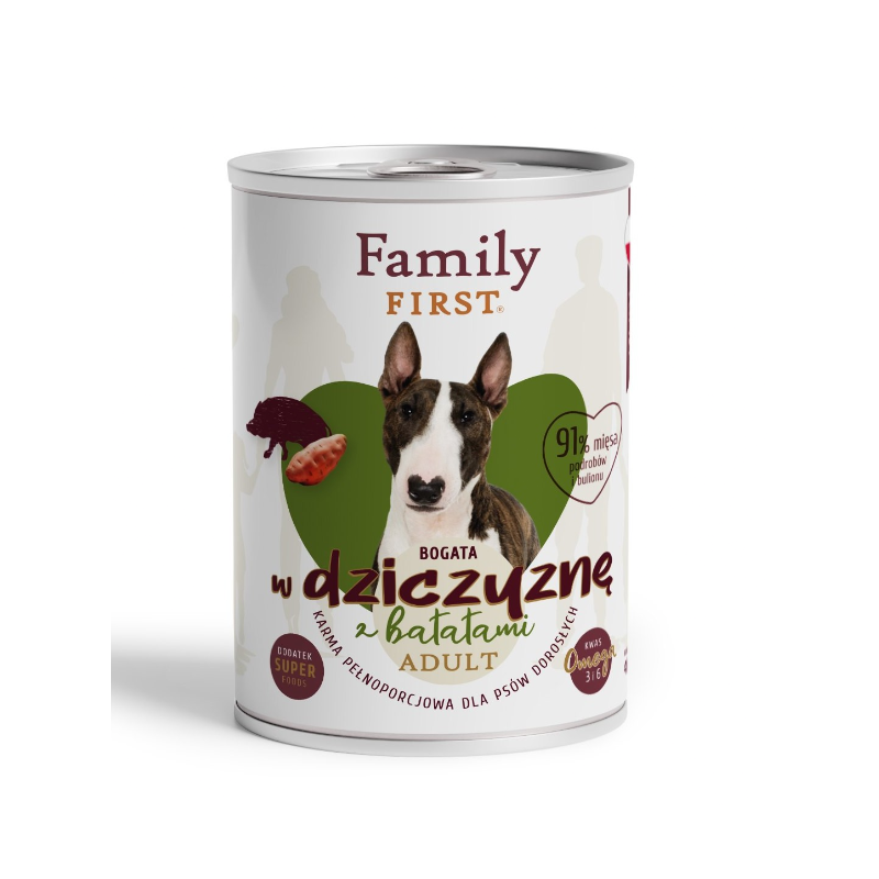 Family First puszka dla psa bogata w dziczyznę z batatami to mokra karma bez pszenicy i kurczaka wspierająca odporność i trawienie.