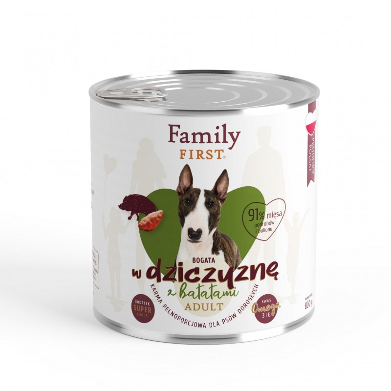 FAMILY FIRST Bogata w Dziczyznę z batatami to starannie skomponowany, mięsny posiłek w dużej puszce 800 g, który wspiera odporność, metabolizm i ogólną kondycję dorosłego psa, zapewniając jednocześnie doskonały smak i wysoką akceptację.