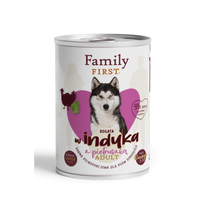 Family First puszka dla psa bogata w indyka z pietruszką to mokra karma bez pszenicy i kurczaka wspierająca trawienie i kondycję.