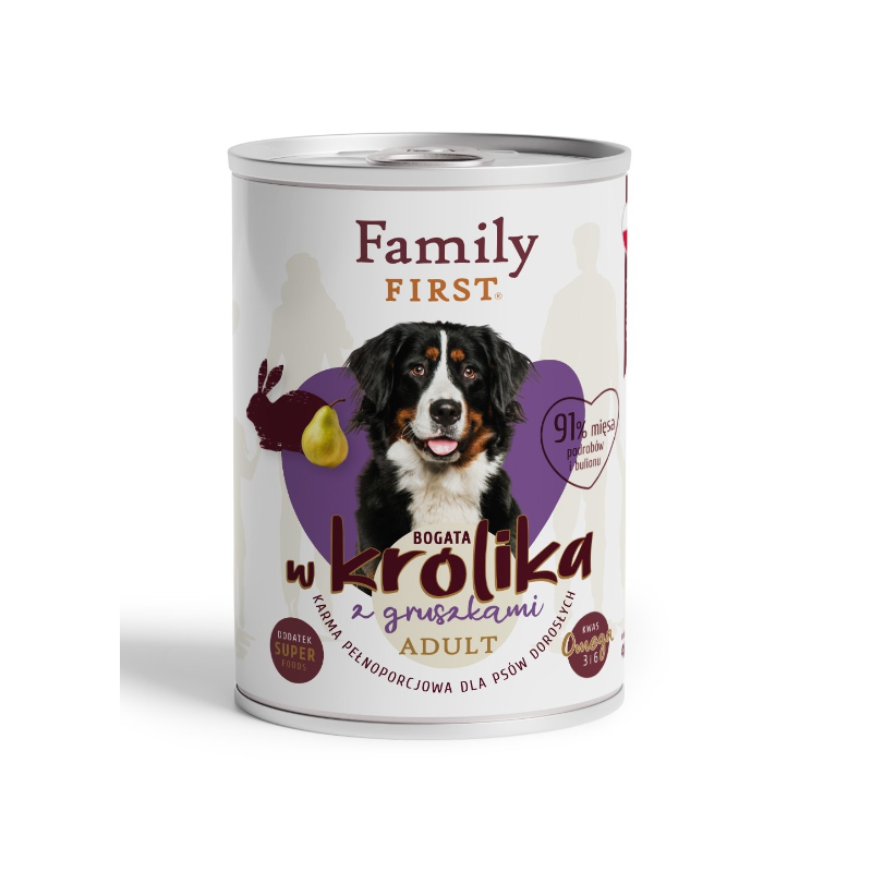 FAMILY FIRST Bogata w Królika z gruszkami 400 g to pełnoporcjowa mokra karma dla psów dorosłych, łącząca delikatne mięso z funkcjonalnymi dodatkami wspierającymi zdrowie i witalność. Receptura nie zawiera pszenicy ani mięsa kurczaka, dzięki czemu jest lekkostrawna i odpowiednia również dla psów z alergiami pokarmowymi.