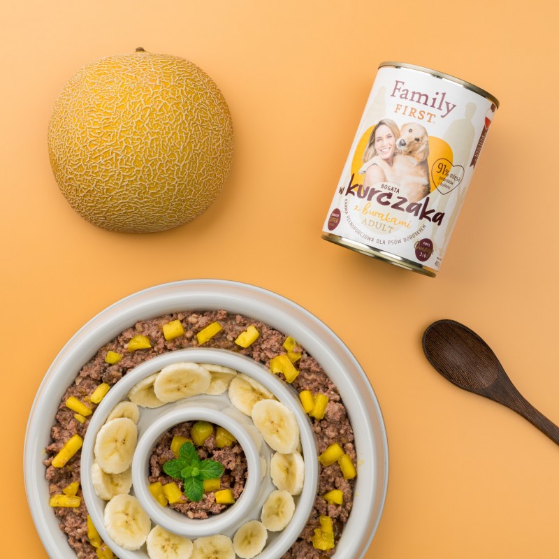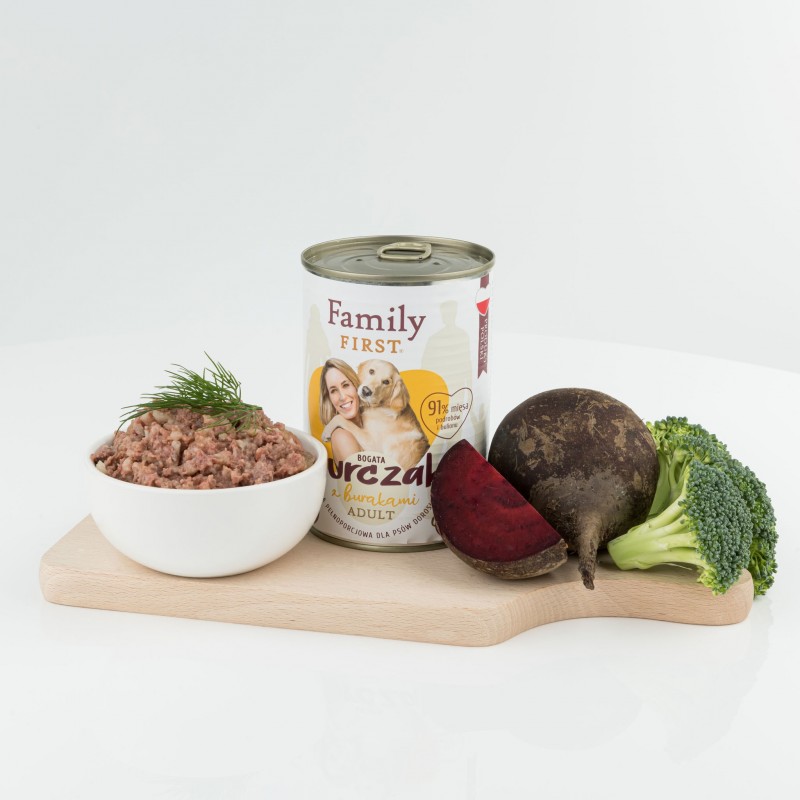 FAMILY FIRST Bogata w Kurczaka z burakami 400 g to pełnoporcjowa mokra karma dla psów dorosłych, łącząca wysoką zawartość mięsa z warzywnymi dodatkami wspierającymi zdrowie i codzienną witalność. Receptura bez pszenicy sprawia, że posiłek jest lekkostrawny i dobrze tolerowany przez psy o wrażliwym układzie pokarmowym.