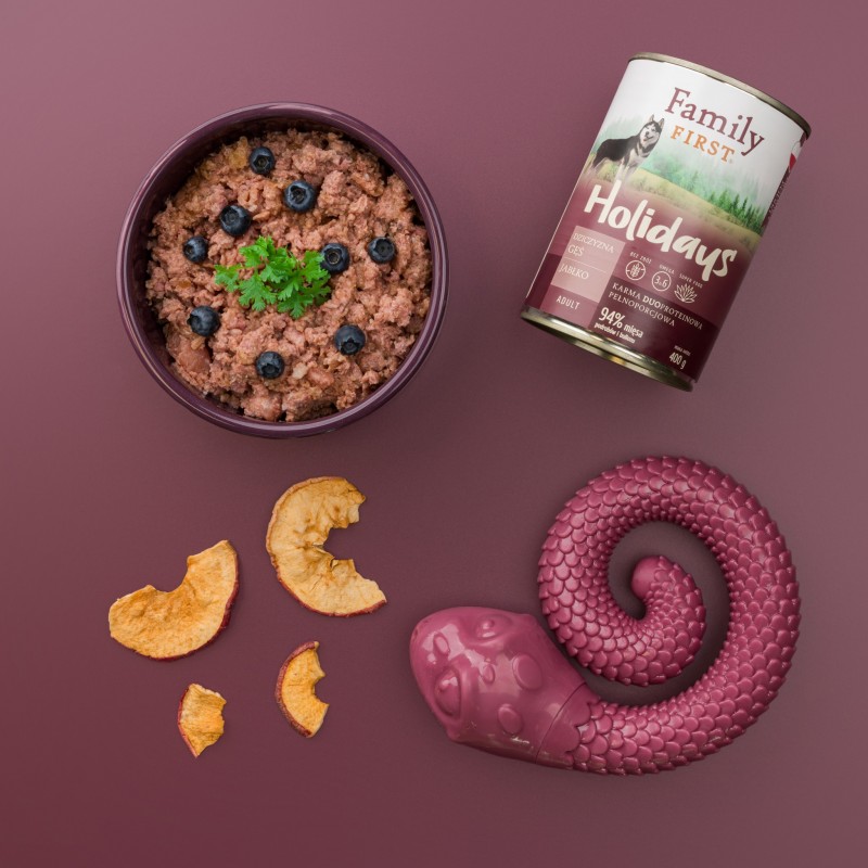FAMILY FIRST Holidays Dziczyzna / Gęś / Jabłko to aromatyczna, mięsna kompozycja która, wspiera odporność, zdrowe stawy i prawidłowe trawienie, zapewniając dorosłemu psu pełnowartościową dietę każdego dnia.