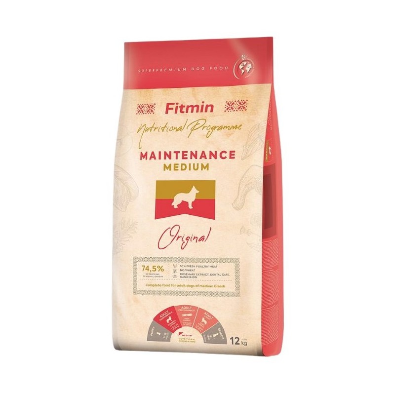 FITMIN Dog Medium Maintenance to doskonale zbilansowana, pełnoporcjowa karma super premium, stworzona specjalnie dla dorosłych psów ras średnich. Ta karma zapewnia idealne połączenie smaku i energii, dostosowane do aktywnego stylu życia psów średniej wielkości, które uwielbiają skakać, biegać i aportować, a także cenią sobie chwile spokoju i relaksu.