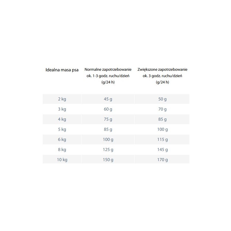 - Białko surowe 26,0%, tłuszcz surowy 14,0%, włókno surowe 2,0%, popiół surowy 7,0%, wapń 1,5%, fosfor 0,95%, sód 0,35%, kwasy tłuszczowe omega-6 3,5%, kwasy tłuszczowe omega-3 0,4%.