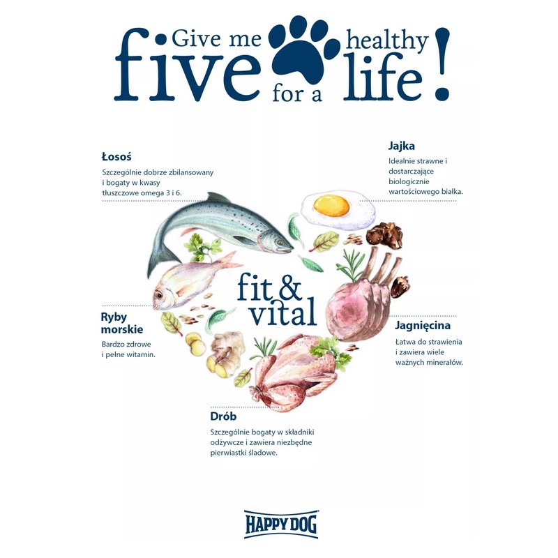 Happy Dog fit & vital Mini Adult to pełnowartościowa karma stworzona specjalnie dla małych psów do 10 kg. Lekkostrawna i zbilansowana receptura dostarcza wszystkiego, czego Twój pupil potrzebuje, aby cieszyć się zdrowiem i energią. Co sprawia, że ta karma jest wyjątkowa? Różnorodność białek z pięciu różnych składników: łososia, ryb morskich, jaj, jagnięciny i drobiu.