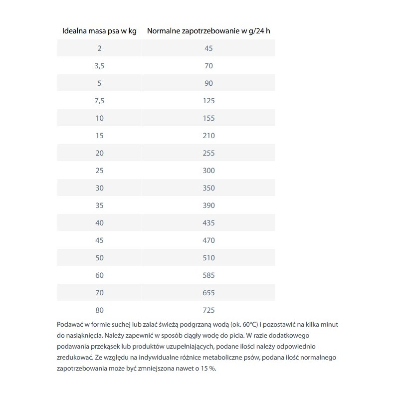- białko surowe 22,0 %, tłuszcz surowy 9,0 %, włókno surowe 2,5 %, popiół surowy 5,5 %, wapń 1,2 %, fosfor 0,85 %, sód 0,2 %, kwasy tłuszczowe omega-6 2,0 %, kwasy tłuszczowe omega-3 0,2 %,