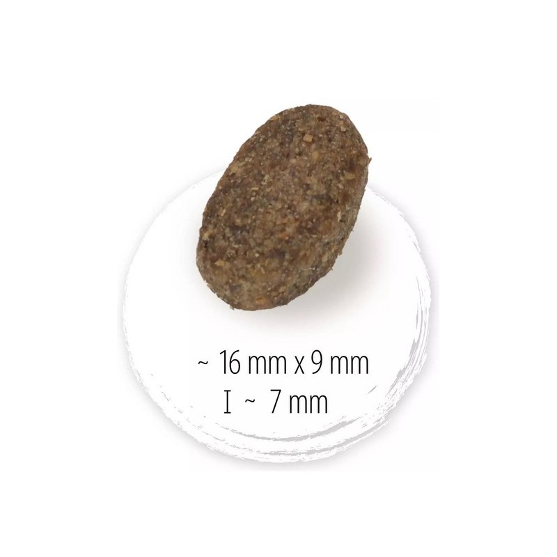 - białko surowe 22,0 %, tłuszcz surowy 9,0 %, włókno surowe 3,0 %, popiół surowy 6,5 %, wapń 1,5 %, fosfor 1,0 %, sód 0,25 %, potas 0,6 %, magnez 0,12 %, kwasy tłuszczowe omega-6 2,2 %, kwasy tłuszczowe omega-3 0,2 %,
