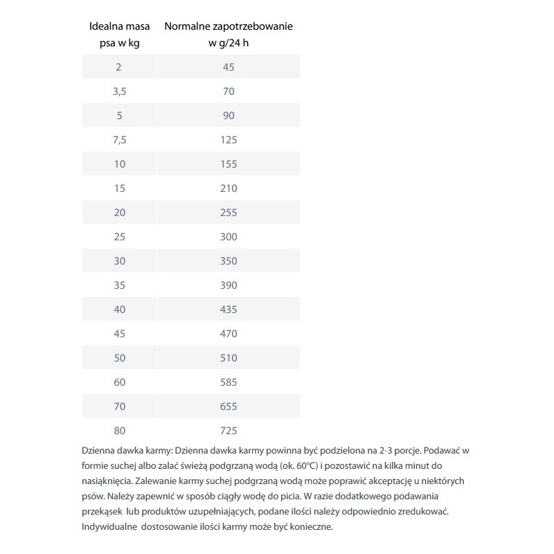 - białko surowe 21,0 %, tłuszcz surowy 8,0 %, włókno surowe 2,5 %, popiół surowy 5,0 %, wapń 0,9 %, fosfor 0,7 %, sód 0,25 %, potas 0,5 %, magnez 0,1 %, kwasy tłuszczowe omega-6 1,8 %, kwasy tłuszczowe omega-3 0,2 %,