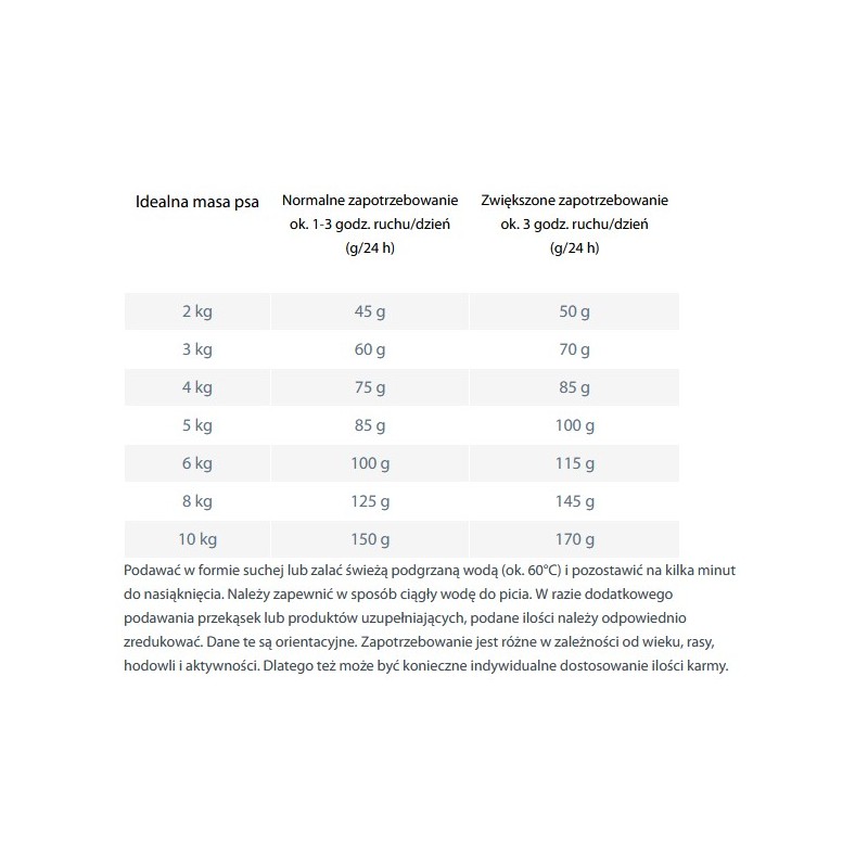 - białko surowe 24,0 %, tłuszcz surowy 12,0 %, włókno surowe 2,5 %, popiół surowy 8,5 %, wapń 1,3 %, fosfor 0,95 %, sód 0,45 %, kwasy tłuszczowe omega-6 2,5 %, kwasy tłuszczowe omega-3 0,3 %,