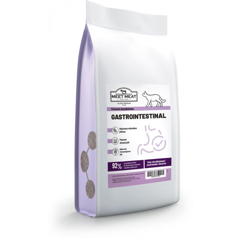 Karma Meet Meat Gastrointestinal to pełnoporcjowa sucha karma dla kotów dorosłych i sterylizowanych, opracowana z myślą o kompleksowym wsparciu układu trawiennego oraz poprawie przyswajalności składników odżywczych. Receptura została zaprojektowana tak, aby odpowiadać na potrzeby kotów z wrażliwym przewodem pokarmowym, problemami trawiennymi oraz zwiększoną podatnością na nietolerancje pokarmowe.